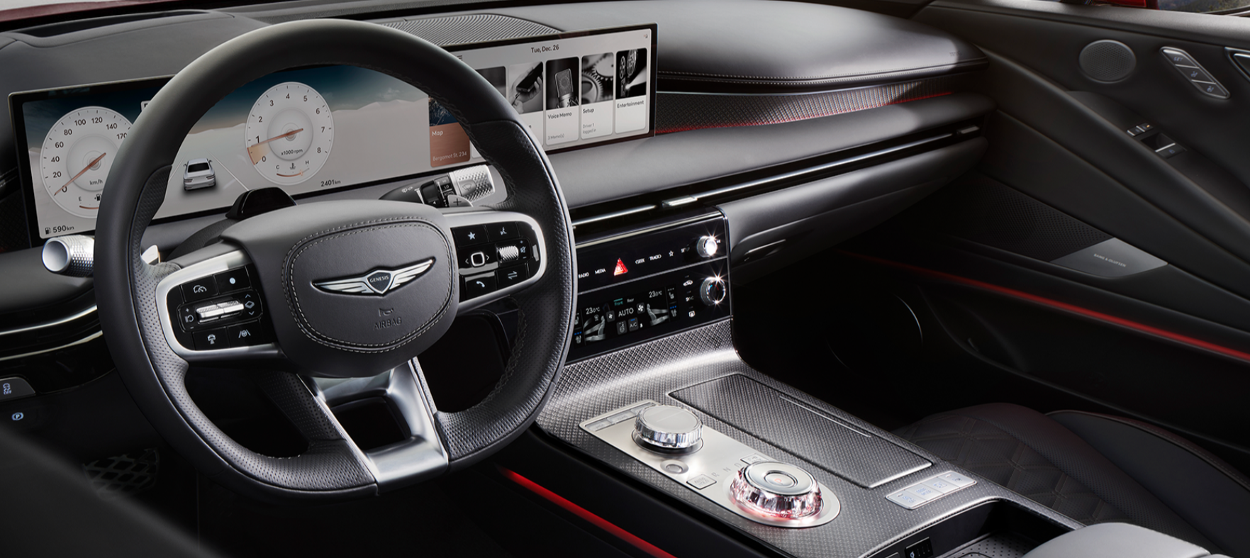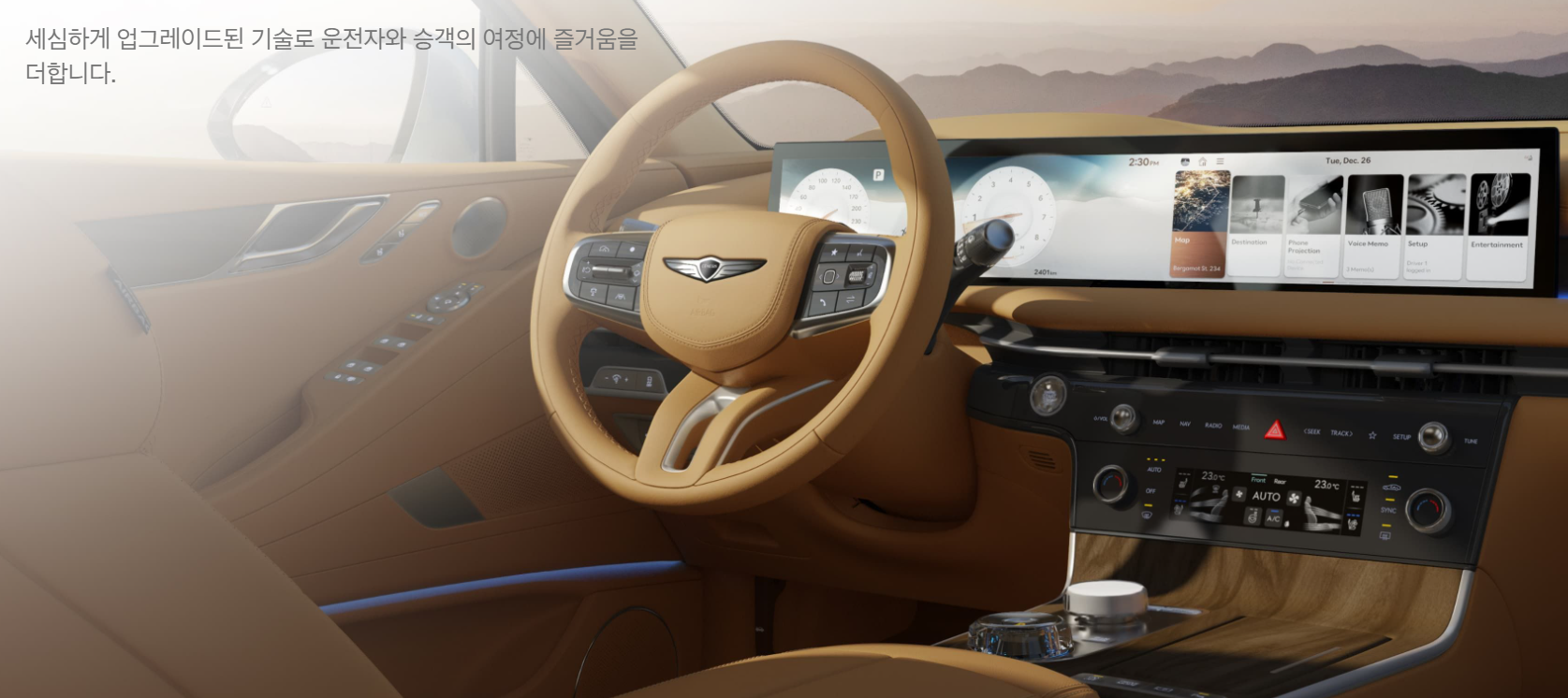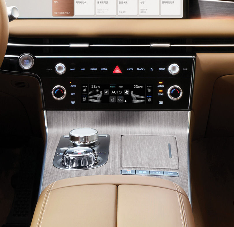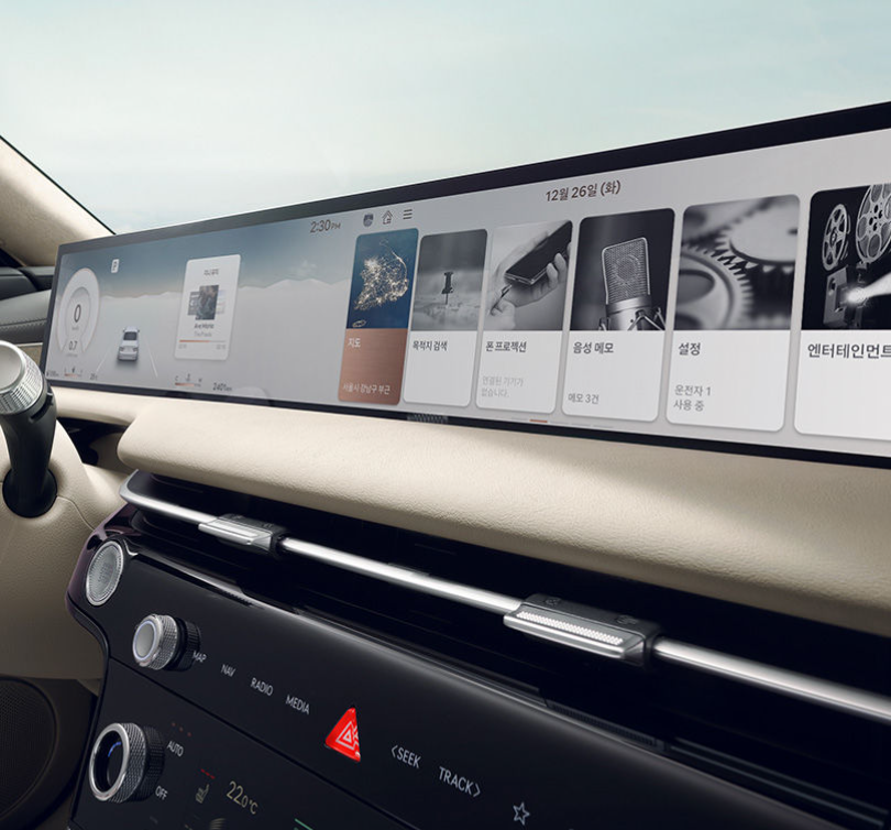 센터패시아를 보겠습니다. 제네시스의 그래픽은 정말 우아하고 고급스럽다고 생각이 되는데요, 클러스터와 센터 스크린이 합쳐져 가로로 긴 스크린이 되었습니다.